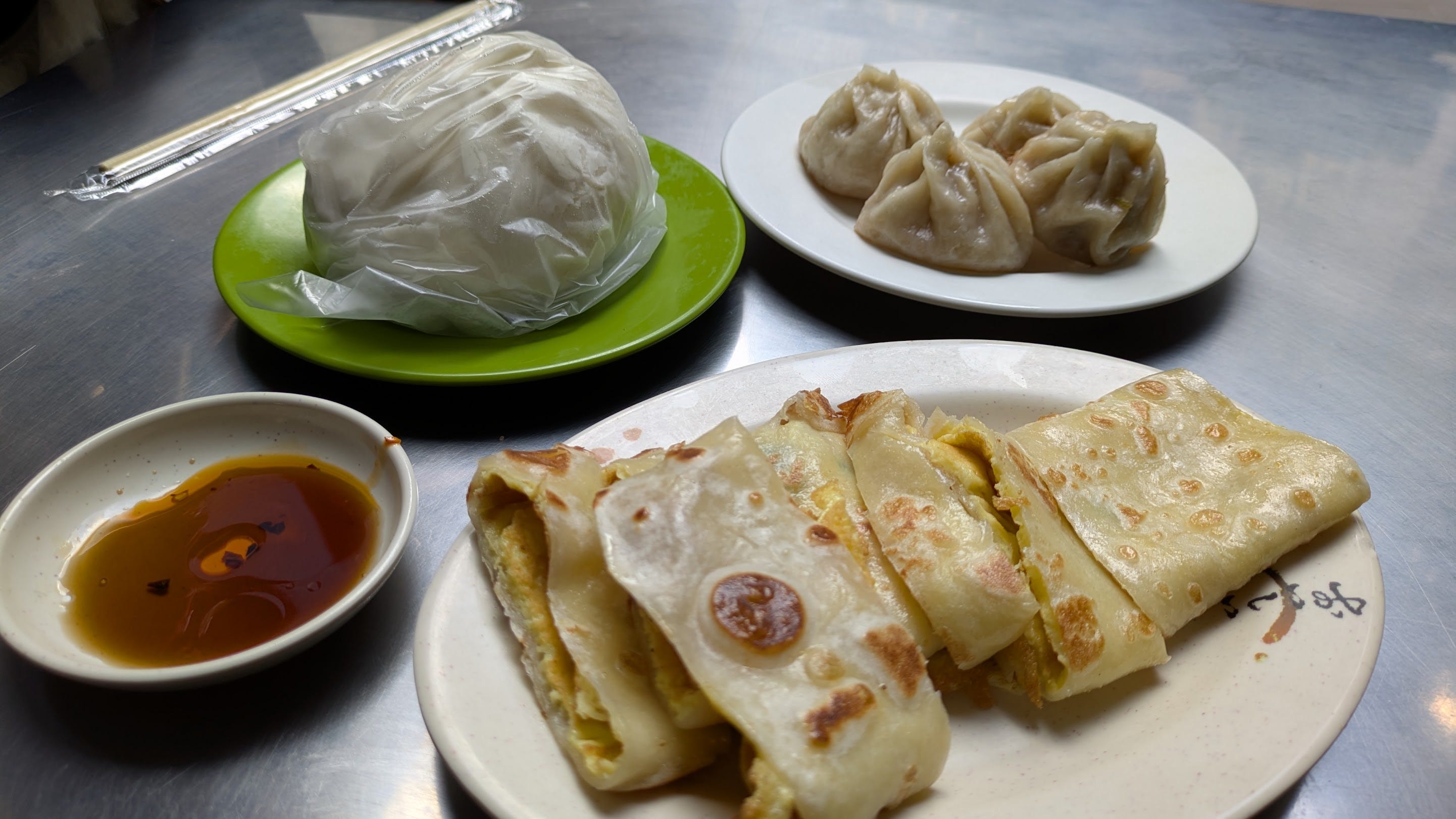 前回よりも並んでいたと思いますが、20分ぐらい待ってお目当てのダンピン(上の写真手前のクレープみたいなの)と野菜饅頭、小籠包、写真には写ってませんが、鹹豆漿、豆乳+米乳のハーフ&ハーフを注文。 朝からわんぱくなのは台灣では当然という感じでガッツリ食べました。